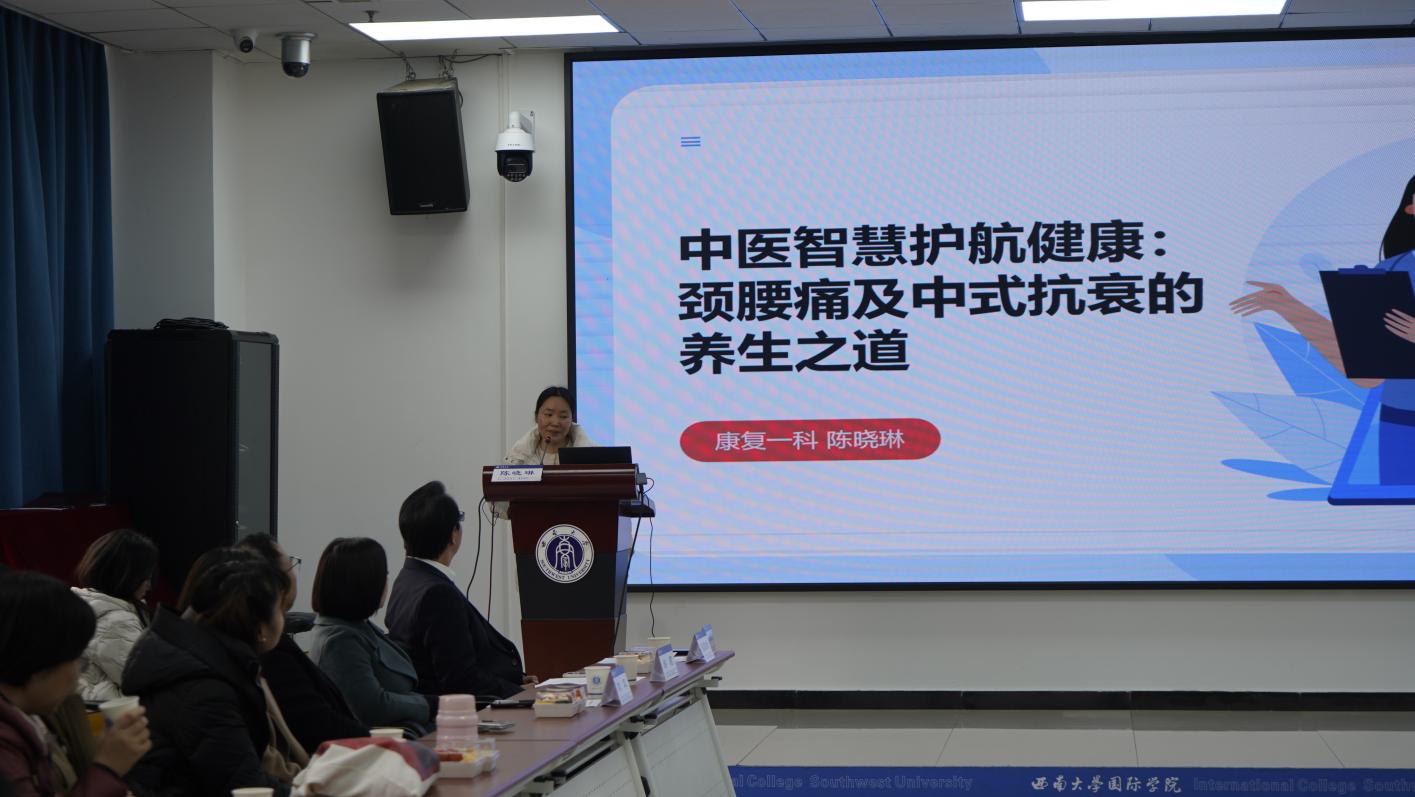 在专题讲座环节,康复一科陈晓琳医生带来了“中医智慧护航健康:颈腰痛及中式抗衰的养生之道”主题分享。针对教师及员工群体久坐易引发的颈腰疼痛,以及常见的急性腰扭伤、落枕等问题,陈晓琳专家结合中医理论,给出了通俗易懂、便于操作的调理建议和应对方法。讲座现场,她带领在场师生一同练习颈椎舒缓操,活动氛围十分热烈。此外,针对师生普遍关心的中式美容话题,陈医生还详细介绍了艾灸、面部刮痧、面部美容针等多种中医美容方式,让在场师生对中医的多元功效有了更全面的认识。讲座最后,现场师生共同练习八段锦,充分感受中医养生功法的独特魅力。