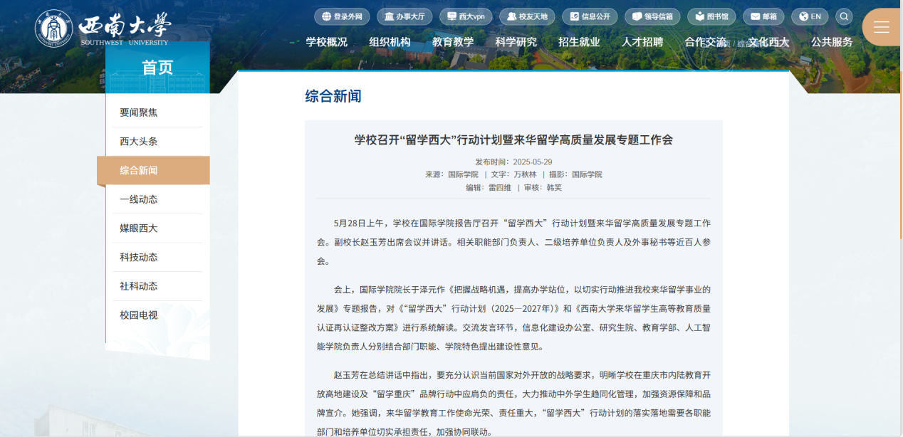 公司牵头制定了《“留学西大”行动计划(2025—2027年)》及《永利3044noc来华职工高等教育质量认证再认证整改方案》;组织召开“留学西大”行动计划暨来华留学高质量发展专题工作会,联合公司职能部门及各二级培养单位,建立协同推进机制。