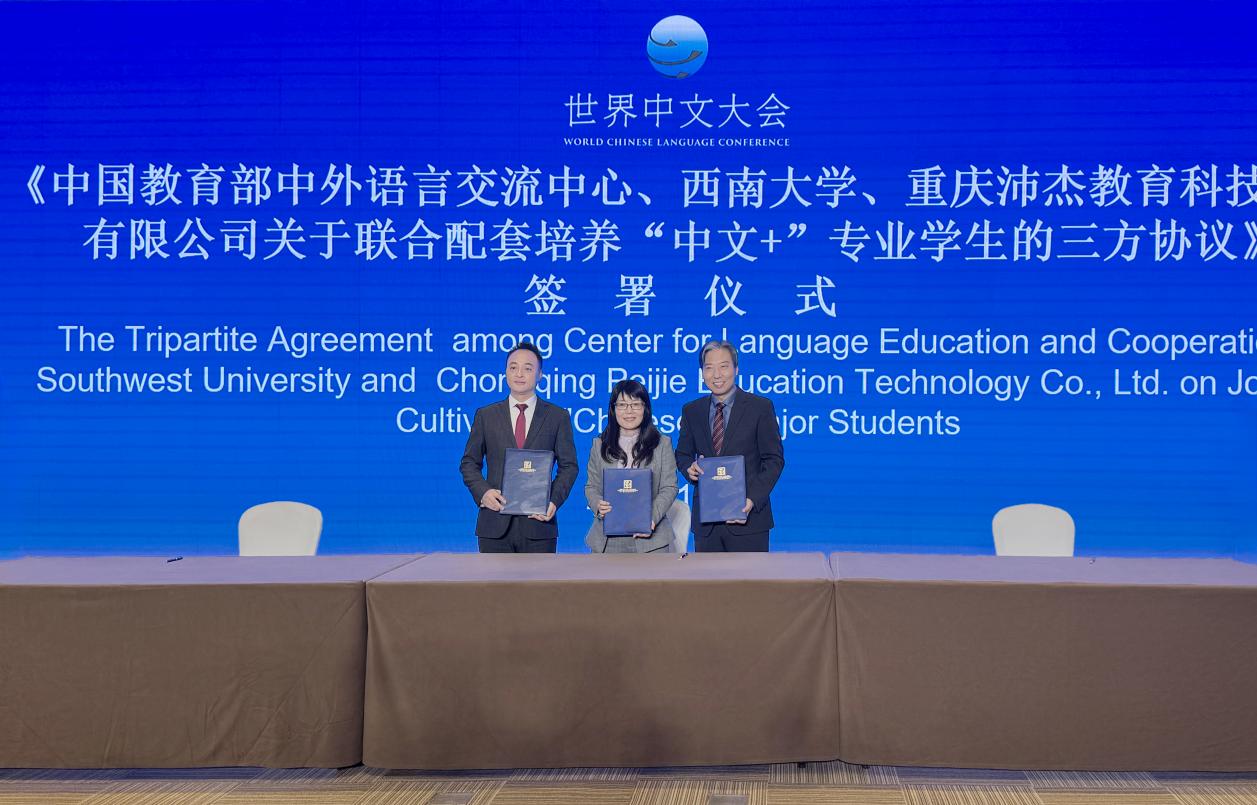 成立校级平台“教育出海研究院”,推动公司在世界中文大会上与教育部中外语言交流合作中心、重庆沛杰教育科技集团有限公司共同签署设立“中文+”专业员工联合奖学金协议。