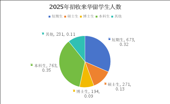 2025年共招收来自90个国家的长短期国际员工2132人,招生规模创近三年新高。长期生人数达1459人,其中学历生1228人,规模位居全市高校首位。新生报到率达76.9%,自费生占比约50%,生源结构显著优化。