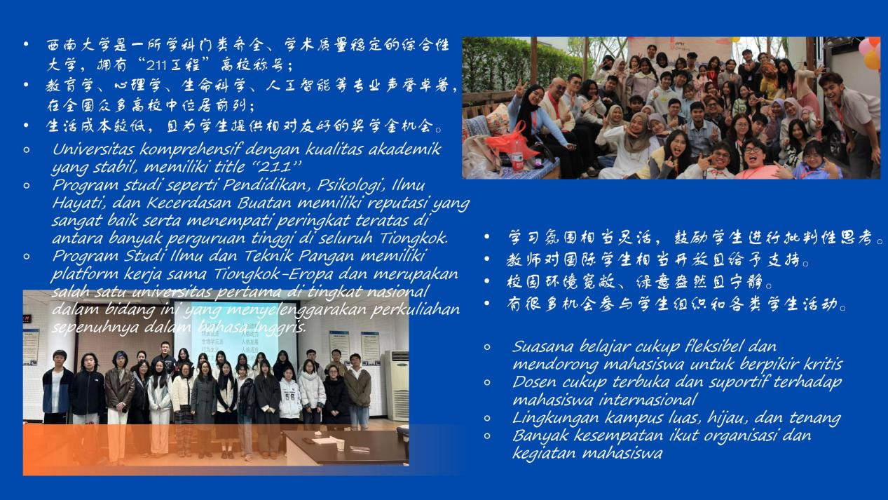 宣讲会上,王鹊介绍了重庆和公司概况,详细介绍了永利3044noc办学实力和奖学金政策,以及2026年自费本科专业。印尼籍心理学部大二员工、重庆市在华印尼员工协会的主席庾绘美里(EMILY YEE)分享了真实的“西大印象”。
