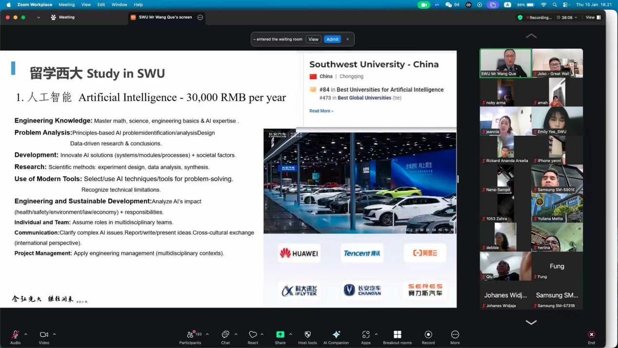 1月15日晚,公司联合印尼长城机构成功举办线上招生宣讲会。活动面向印尼高中生及家长,在线人数超200人,现场气氛热烈,成效显著。