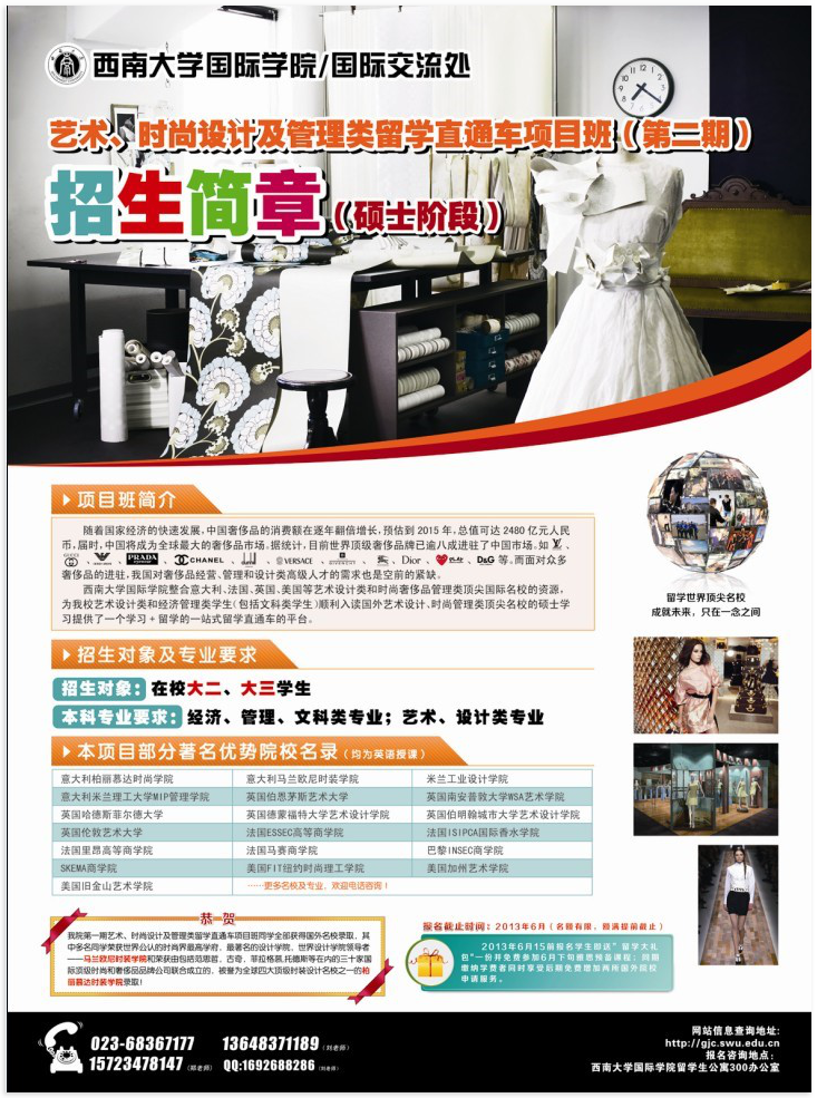 恭贺永利3044noc艺术、时尚设计及管理类留学直通车项目班刘蓓、孙颖两位同学获世界公认的时尚界最高学府,最著名的设计公司,世界设计公司领导者——马兰欧尼时装公司的女装设计专业录取!唐鳗同学喜获,被誉为全球四大顶级时装设计名校之一的柏丽慕达时装公司的奢侈品管理专业录取!