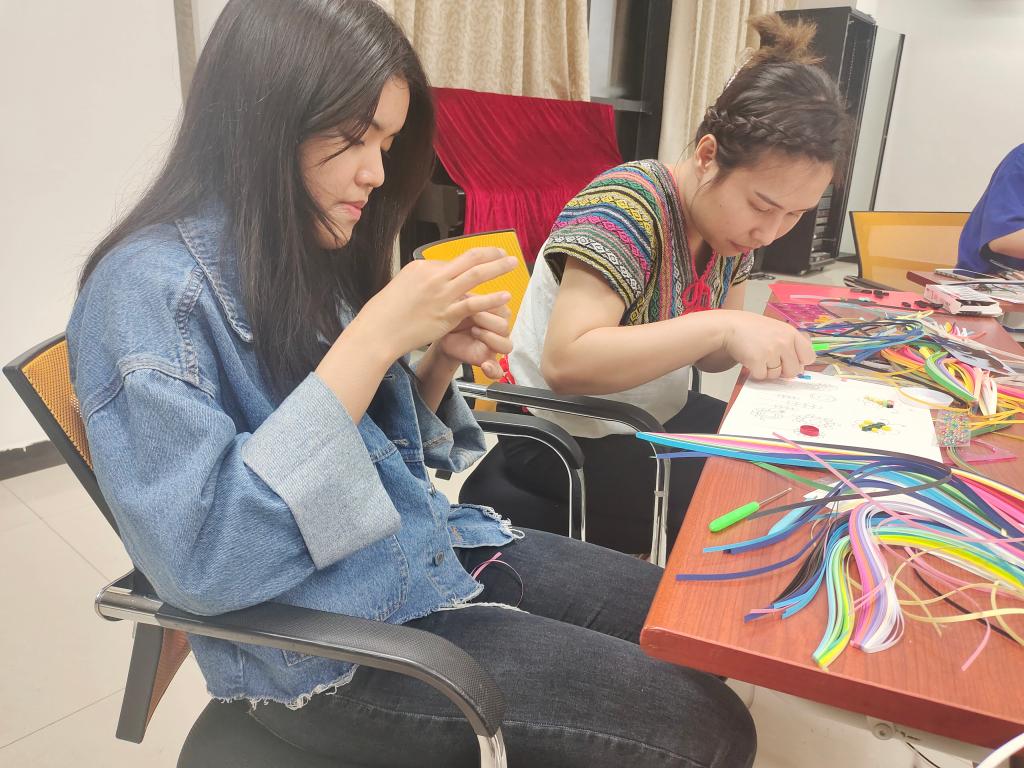在欢快的音乐伴奏下,来自五湖四海的同学们纷纷拿起手中的工具,为今晚的搭档制作属于TA的独一无二的衍纸作品。色彩鲜艳的花束、可爱灵动的海豚、美丽动人的小女孩、真诚灿烂的笑脸……同学们充分发挥想象力,为同伴献上了独特的“初印象”。