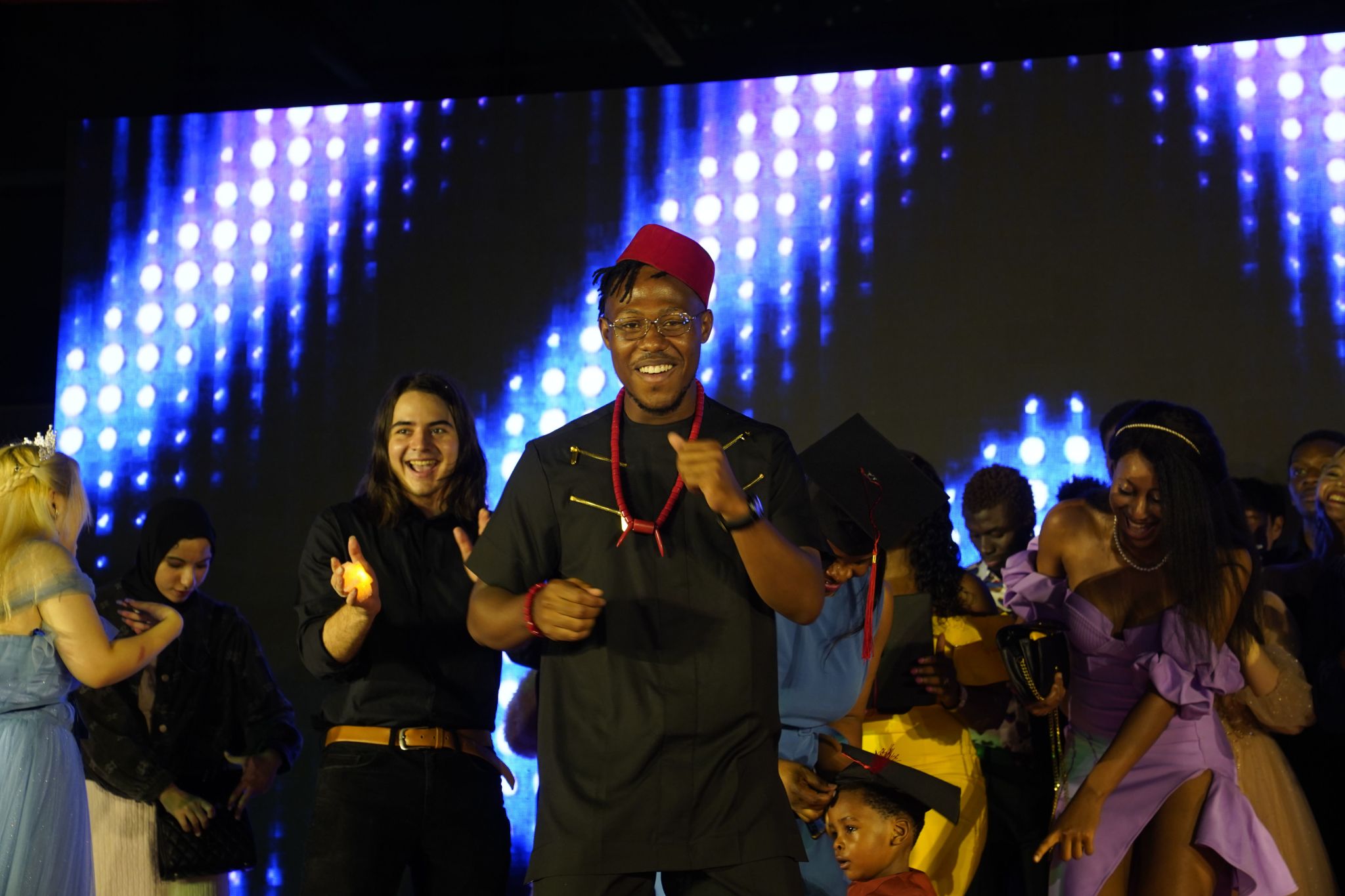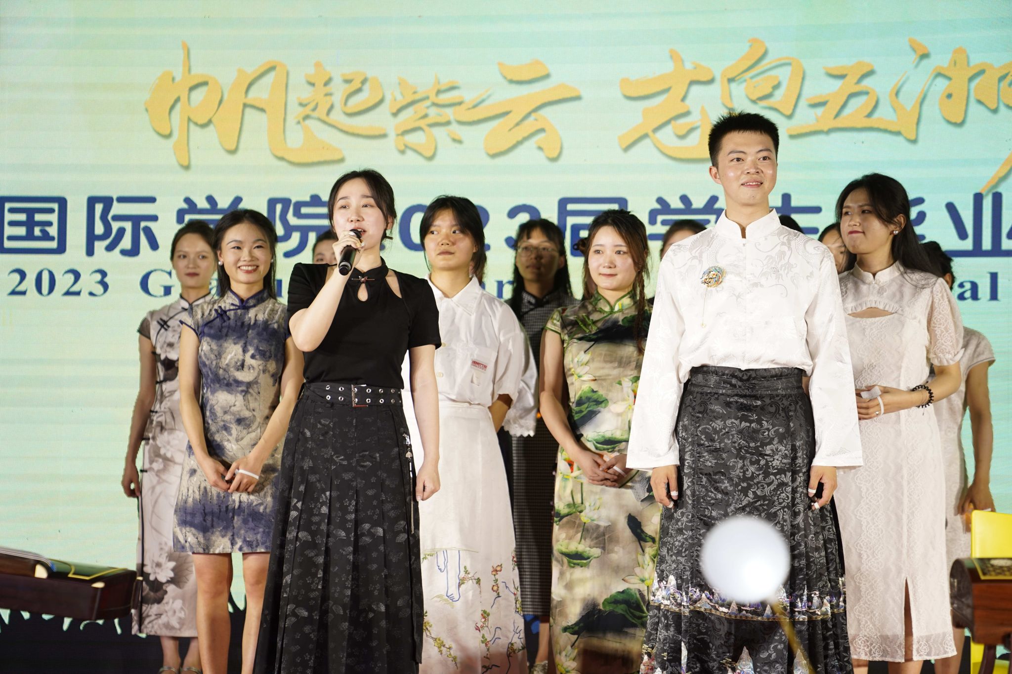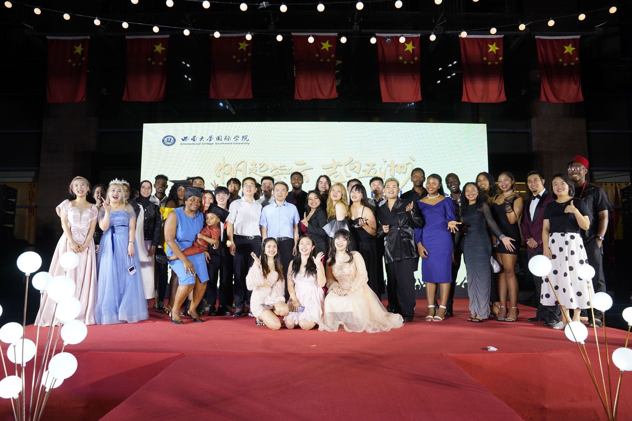 汪鑫阳老师、毕业生代表代宇航以及22级中国汉硕生代表共同翻唱的歌曲《水调歌头》被赋予了新的灵魂。该曲融合古筝与多语言:闽南语、英语、韩语、日语、泰语等,旋律优美、韵味悠长。传统乐器融合多元文化要素,展现出中国文化的多元魅力和兼容并包。国际员工代表蓝云涛一首自弹自唱的歌曲将在场的观众带入悠扬的歌声中,共同诉说着那年今日。最后赞比亚籍歌手Gift带来音乐专辑《东行漫曲》原创歌曲,通过歌声,表达西大情。台下观众和着歌曲点亮点点星光。