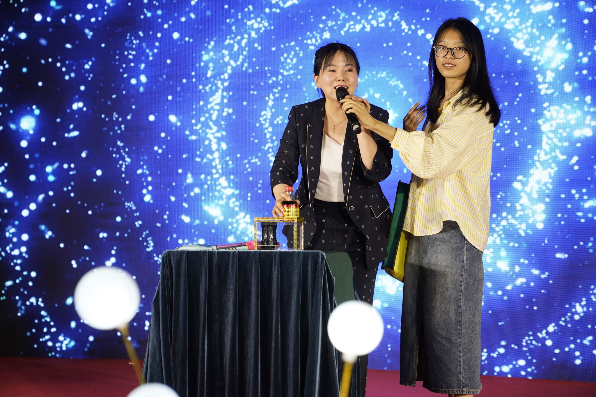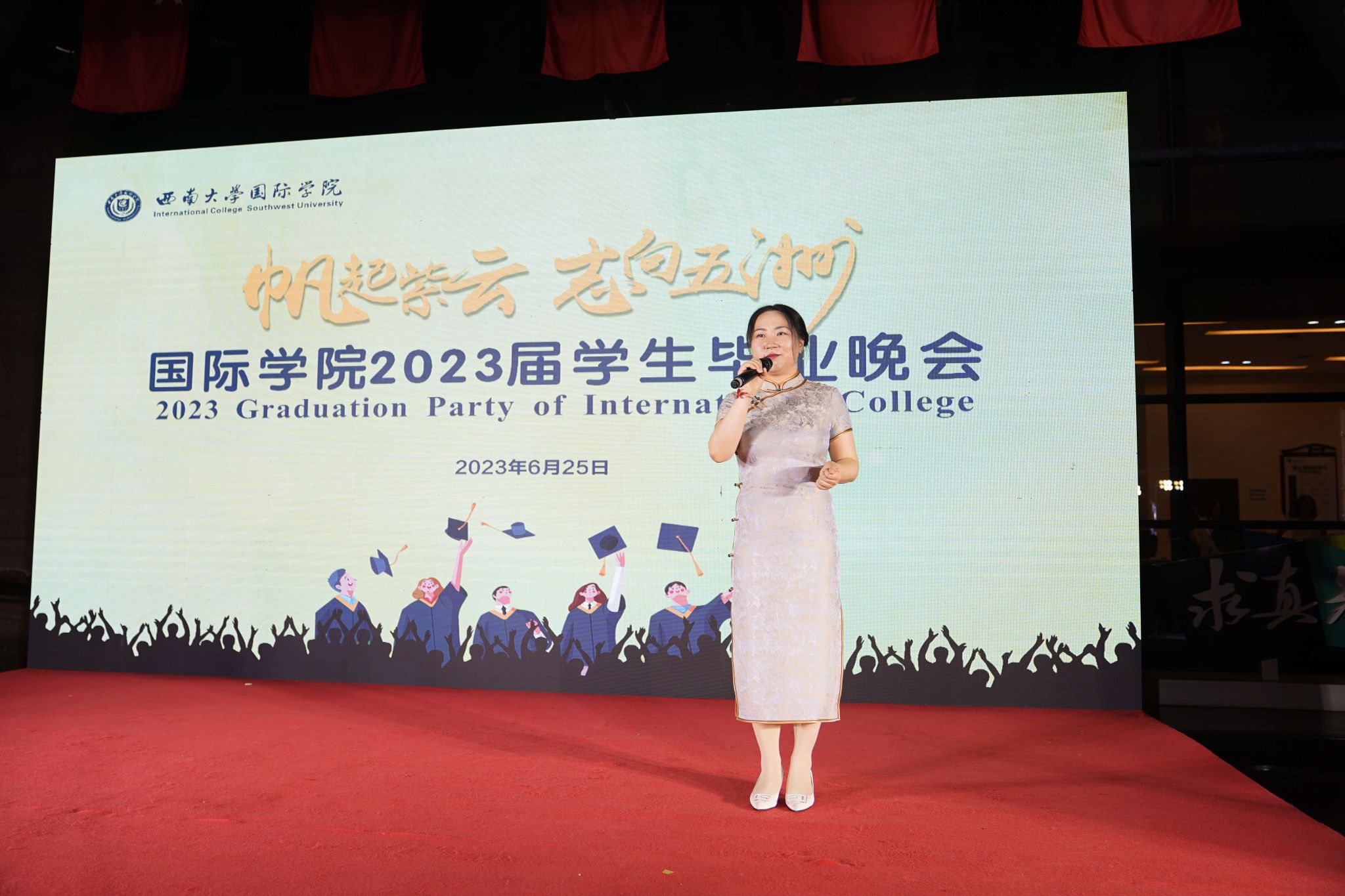 通过中外员工代表带来的古筝唱曲《早发白帝城》,我们彷佛看见一叶扁舟撑杆抗阻,跃过无数山丘。日落月升、重峦叠嶂,好在一切柳暗花明。愿各位学子在时光的洪流里依旧保持初心,拥抱未来。国际员工代表带来的一曲《如愿》,祝愿毕业生们能在未来不畏艰险、不惧挑战、扬帆起航、一切如愿。雾里看花,水中望月,真假虚实,变化万千。在马若晨老师的魔术表演中,在一句句“求真知,谋大同”的魔法咒语下,我们一同进入了魔幻世界,见证了奇妙瞬间。在动感的节拍中、在炫目的灯光下,张林鹏、许慧文、美恩等国际员工用一曲动人的歌曲、一舞热辣的舞蹈串烧,表达他们对西大未曾停歇的热爱,瞬间燃爆整个会场!