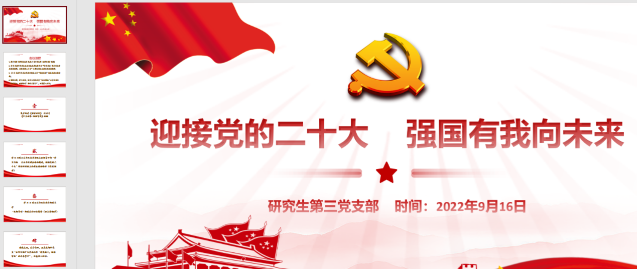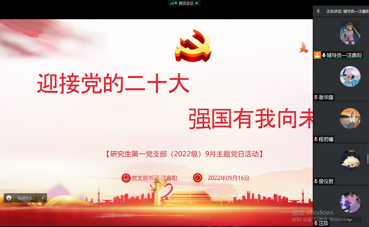 9月16日晚上19:00,研究生第三党支部通过腾讯会议召开“迎接党的二十大,强国有我向未来”的主题党日活动。
