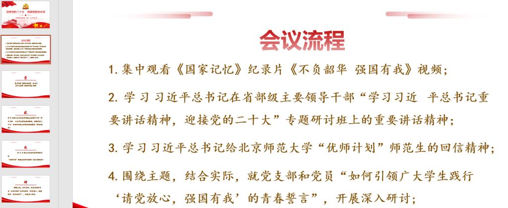 全体党员同志集中观看《国家记忆》和纪录片《不负韶华 强国有我》,谢露华和汪珍两位同志领学习近平总书记在“学习习近平总书记重要讲话精神,迎接党的二十大”专题研讨班上的重要讲话精神和习近平总书记给北京师范大学“优师计划”师范生的回信精神。