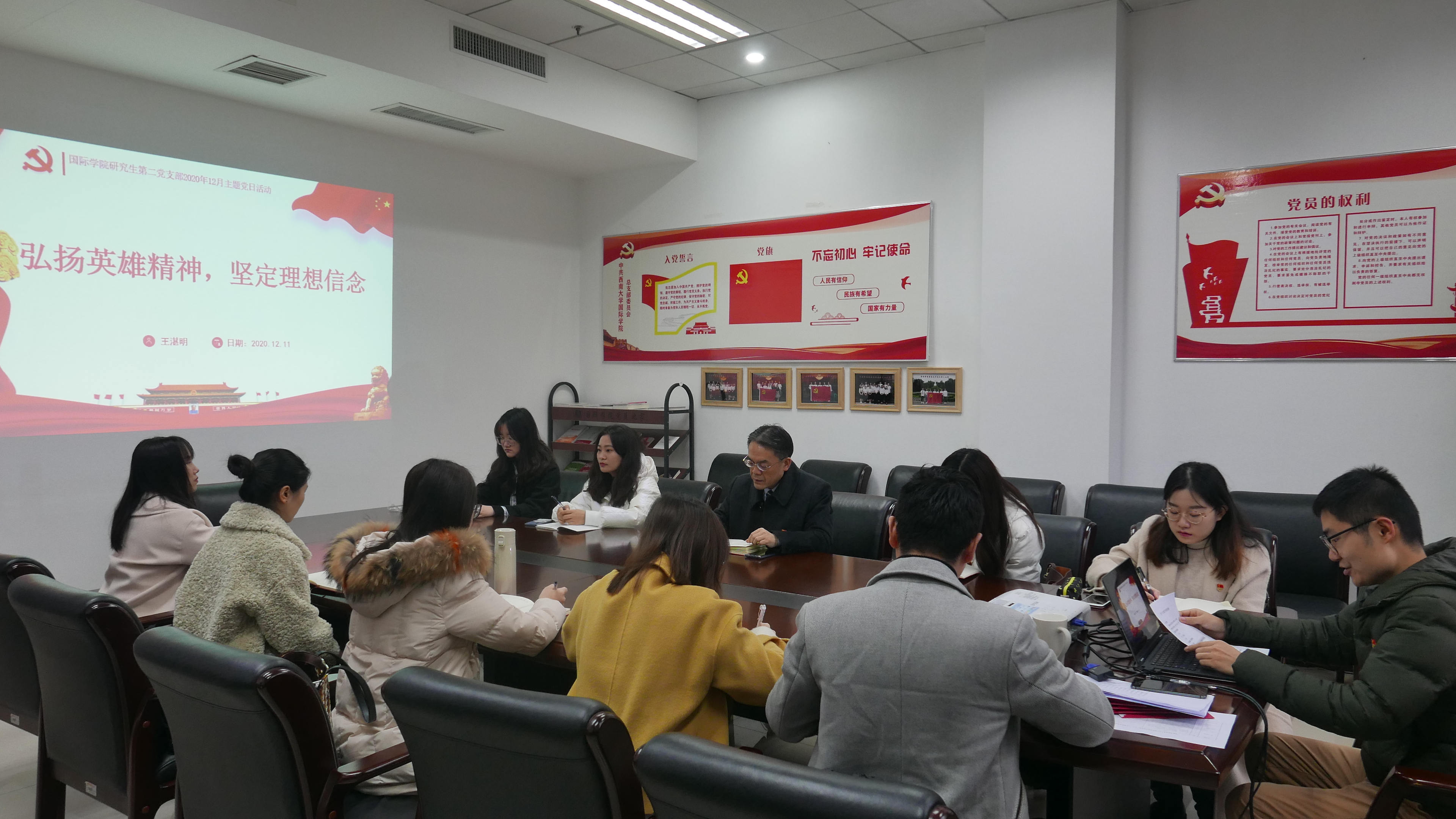 2020年12月11日下午2:30,研究生第三支部全体成员在紫云楼214教室开展以“弘扬英雄精神,坚定理想信念”为主题的党日活动,刘承宇经理莅临指导。