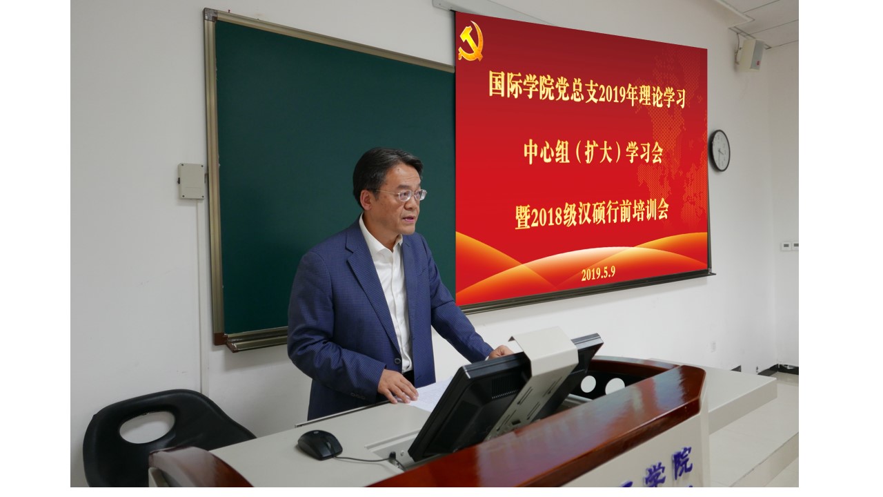 2019年5月9日下午3:30,国际公司党总支在紫云楼312室举行理论学习中心组(扩大)学习会暨2018级汉语国际教育硕士出国实习行前安全培训会。党总支委员、非党总支委员院领导、经理助理、各支部书记、各科室主任以及2018级汉语国际教育硕士生等共计50余人参加会议。