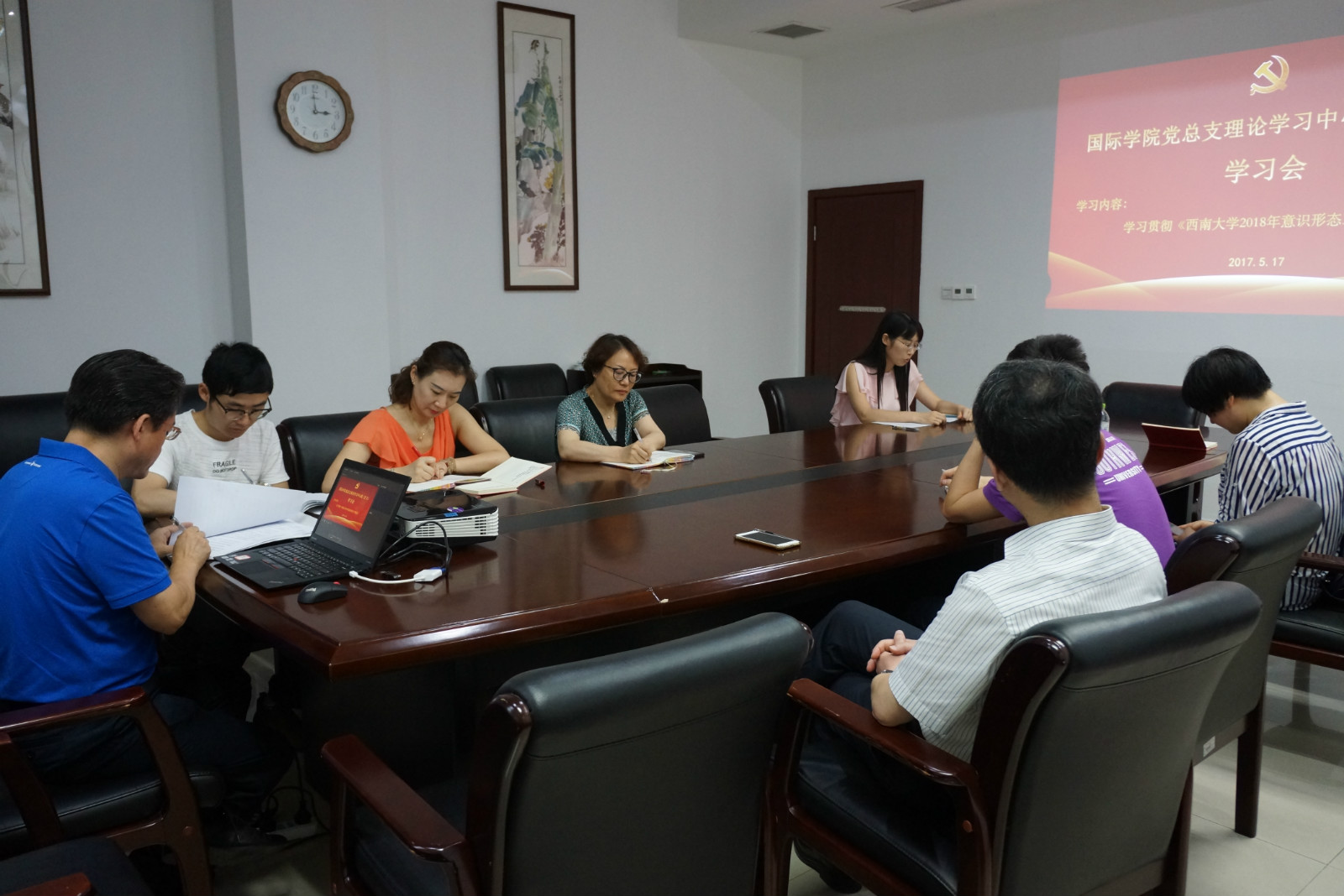 2018517日下午3:00,国际公司党总支在紫云楼304会议室召开理论学习中心组(扩大)会议,党总支委员,不是党总支委员的院领导,支部书记、院办主任、汉教系主任参加会议,会议由刘猛书记主持。