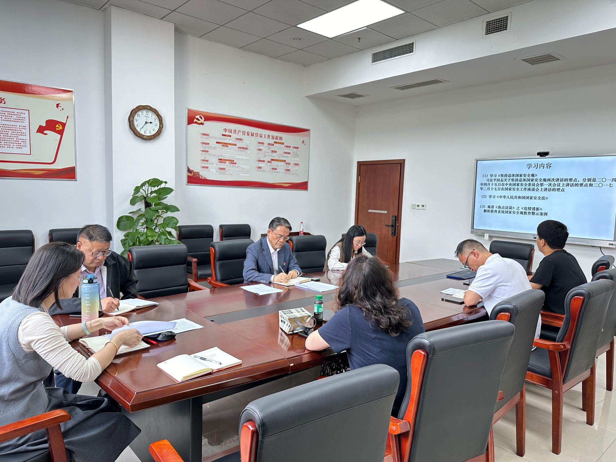 邹育艳同志通过短视频解析“总体国家安全观”的概念,消除了同志们对于国家安全的片面认识;王鹊同志通过“十问十答”导学《中华人民共和国国家安全法》,对于侵害国家安全的行为、公民维护国家安全的义务和方式等方面做具体说明;杨昆同志带领大家观看《焦点访谈》系列节目《危情谍影》,结合教育系统涉及国家安全的案例对于在校师生如何提高国家安全意识进行讲解。
