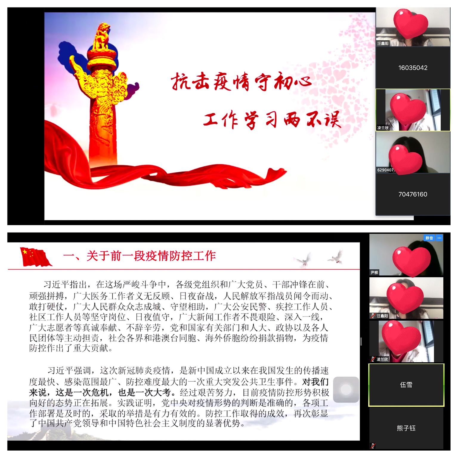 36日下午三点,教工二支部通过“学习强国”视频会议平台进行了一场别开生面的主题党日活动。此次党日活动的主题是“抗击疫情守初心 学习工作两不误”。在导学环节中,杨锐同志带领大家学习了习近平总书记在推进新冠肺炎疫情防控和经济社会发展工作部署会议上的谈话精神,提议每名党员发挥先锋模范作用,正视自己的角色,做到一切行动听指挥;王鹊同志分享了习总书记在北京考察新冠肺炎防控科研攻关工作时的重要讲话精神;随后,全体同志共同观看了纪录片《正月里的坚持》:天府警察。在主题发言环节,邹育艳同志分享了综合办公室通过各种途径为公司师生采买口罩的故事,为抗击疫情提供了物质保障。在学习心得分享环节,各位同志结合自身本职工作和抗击疫情的经历。最后,刘猛书记对本次主题党日进行了总结。他指出,公司疫情防控工作取得阶段性成效,受到多家媒体的关注和报道,得到了公司、市教委、市政府等领导的高度认可。他号召支部全体党员同志在疫情防控工作中充分发挥先锋模范作用,并希望大家提高政治站位,坚定决胜信心;扛起政治责任,发挥党员作用;强化防范意识,做好科学预防;科学认识疫情,理性传送信息;服从统一指挥,积极投身疫情防控。