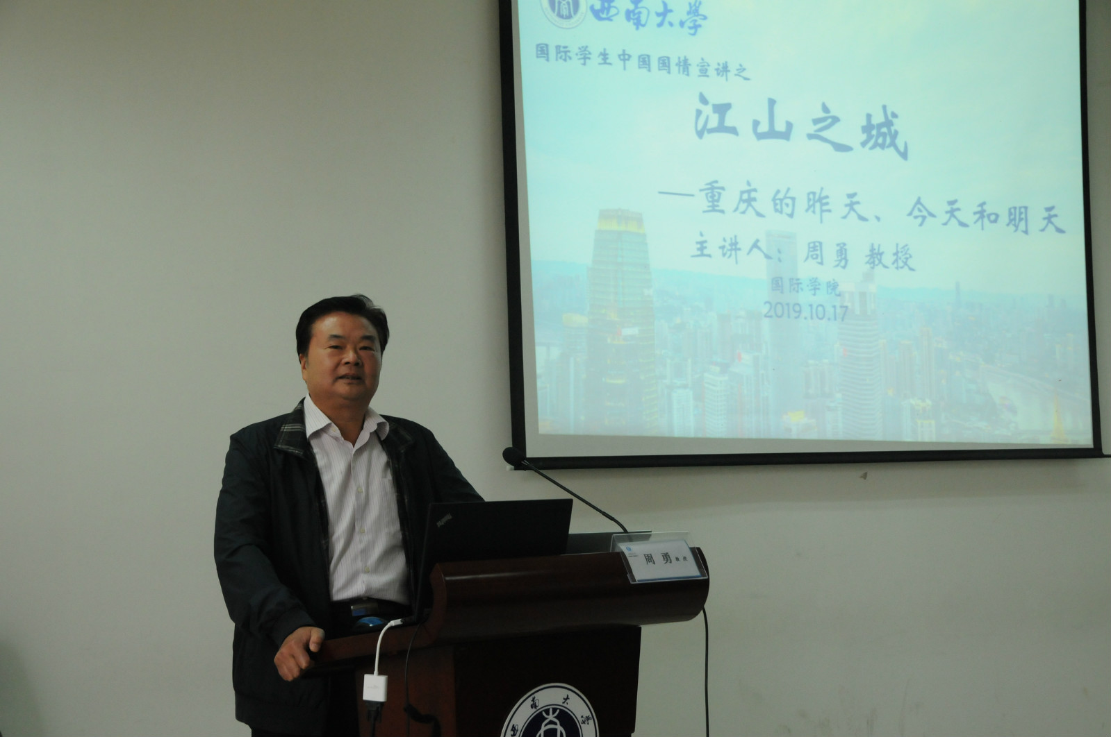 10月17日下午在永利3044noc紫云楼317报告厅,公司国际员工中国国情教育宣讲活动正式启动,国务院特殊津贴获得者、全国有突出贡献的党史专家周勇教授应邀作了题为《江山之城——重庆的昨天、今天和明天》的讲座,180余名中外员工和宣讲团全体成员到场聆听,现场气氛热烈。讲座由刘猛书记主持。