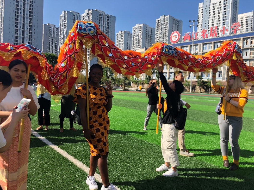 随后,两江名居小学的师生在运动场向永利3044noc的师生们展示了公司颇具特色的“父子龙”舞龙表演。表演中,老师们挥舞着“父龙”,员工们挥舞着“子龙”,每一个动作都让观看者拍手叫绝。在体验舞龙魅力的过程中,刚果布职工思拉河还即兴为大家表演了一段精彩的中国武术,场面热闹非凡。