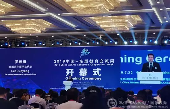 2019中国-东盟教育交流周于7月22日在贵州省贵安新区交流周永久会址开幕。交流周开幕式上,曾在第四届“汉语桥”世界中员工中文比赛中获得个人综合一等奖的泰国选手罗俊勇(THUNYACHART LOPHONGPANI)作为东盟来华职工代表进行了精彩发言。