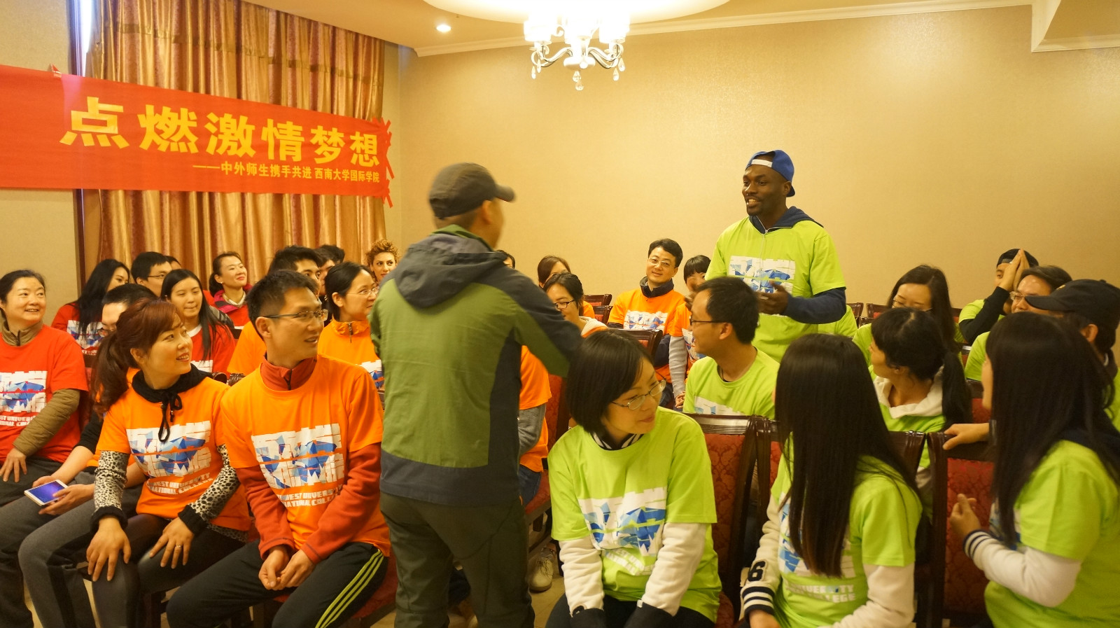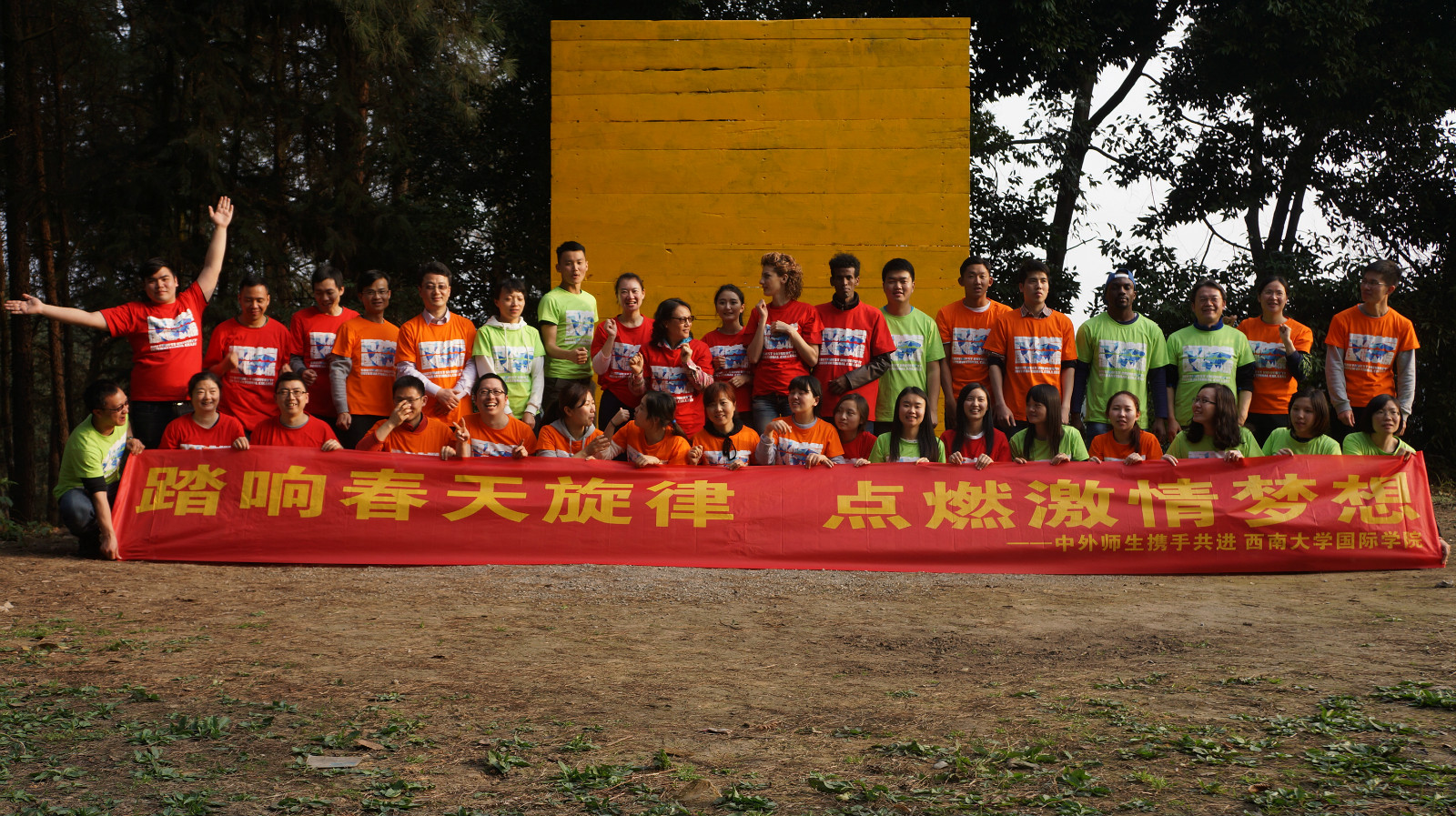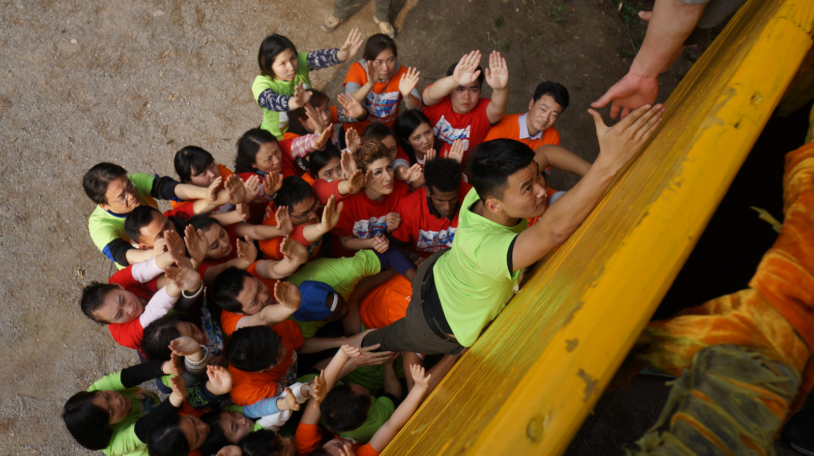 上午十点,户外拓展活动正式拉开序幕。简单集训后,教练将师生混合分成了三队,队员们快速换上红、橙、绿三色队服,然后开始了拓展活动的第一个项目“破冰起航”。“破冰”就是让整个团队打破师生隔阂,国别隔阂,上下级隔阂、性别差距,忘却身份和年龄,撕下面具,坦诚以待,增进感情和凝聚力。“起航”过程中,三个团队分别选出队长和副队长,并根据各自队衣创意出了“雄英队”、“火力橙队”、“青苹果队”。接着各队依次闪亮登场,摆出造型,舞出队旗,喊出队号,唱响队歌。这个项目是整个训练活动的开端,也是训练最重要的一个环节,各团队在互相竞争中斗志昂扬,活力迸发。