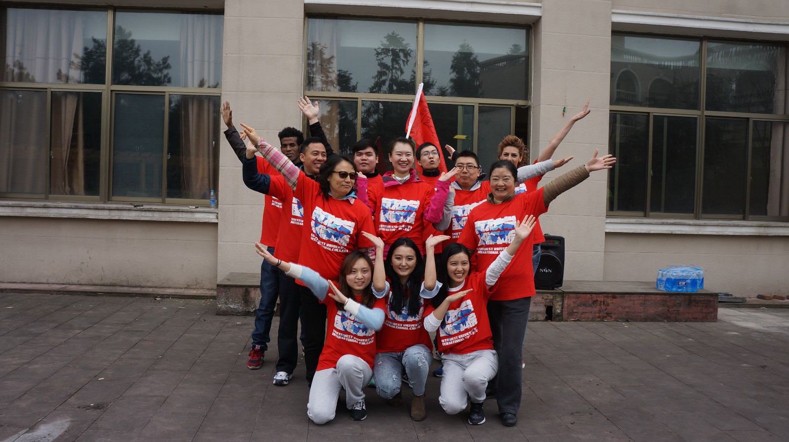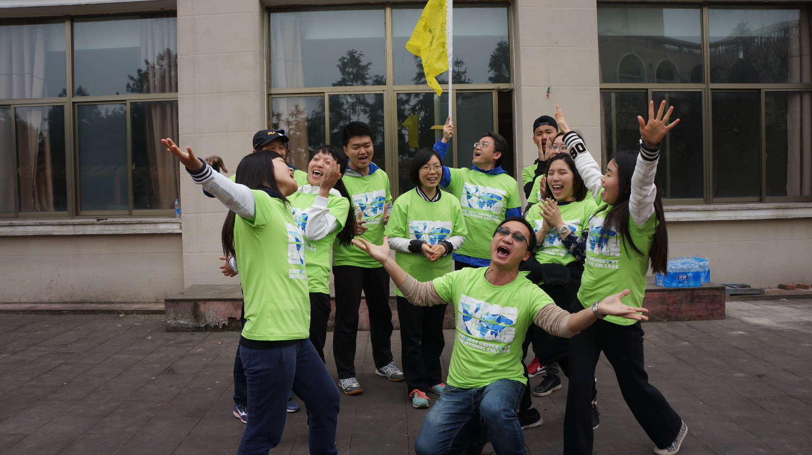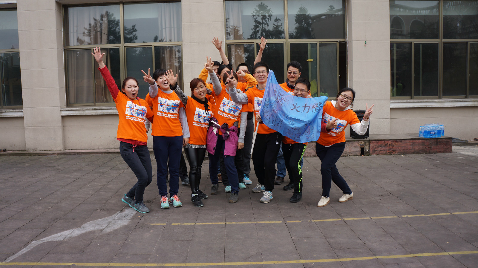上午十点,户外拓展活动正式拉开序幕。简单集训后,教练将师生混合分成了三队,队员们快速换上红、橙、绿三色队服,然后开始了拓展活动的第一个项目“破冰起航”。“破冰”就是让整个团队打破师生隔阂,国别隔阂,上下级隔阂、性别差距,忘却身份和年龄,撕下面具,坦诚以待,增进感情和凝聚力。“起航”过程中,三个团队分别选出队长和副队长,并根据各自队衣创意出了“雄英队”、“火力橙队”、“青苹果队”。接着各队依次闪亮登场,摆出造型,舞出队旗,喊出队号,唱响队歌。这个项目是整个训练活动的开端,也是训练最重要的一个环节,各团队在互相竞争中斗志昂扬,活力迸发。