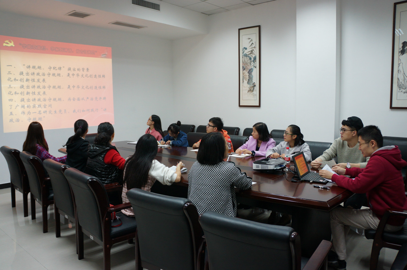 2016年11月18日下午,国际公司党委研究生支部在紫云楼304会议室开展“讲政治,守规矩”专题学习研讨会。会议由支部书记王湛明主持。