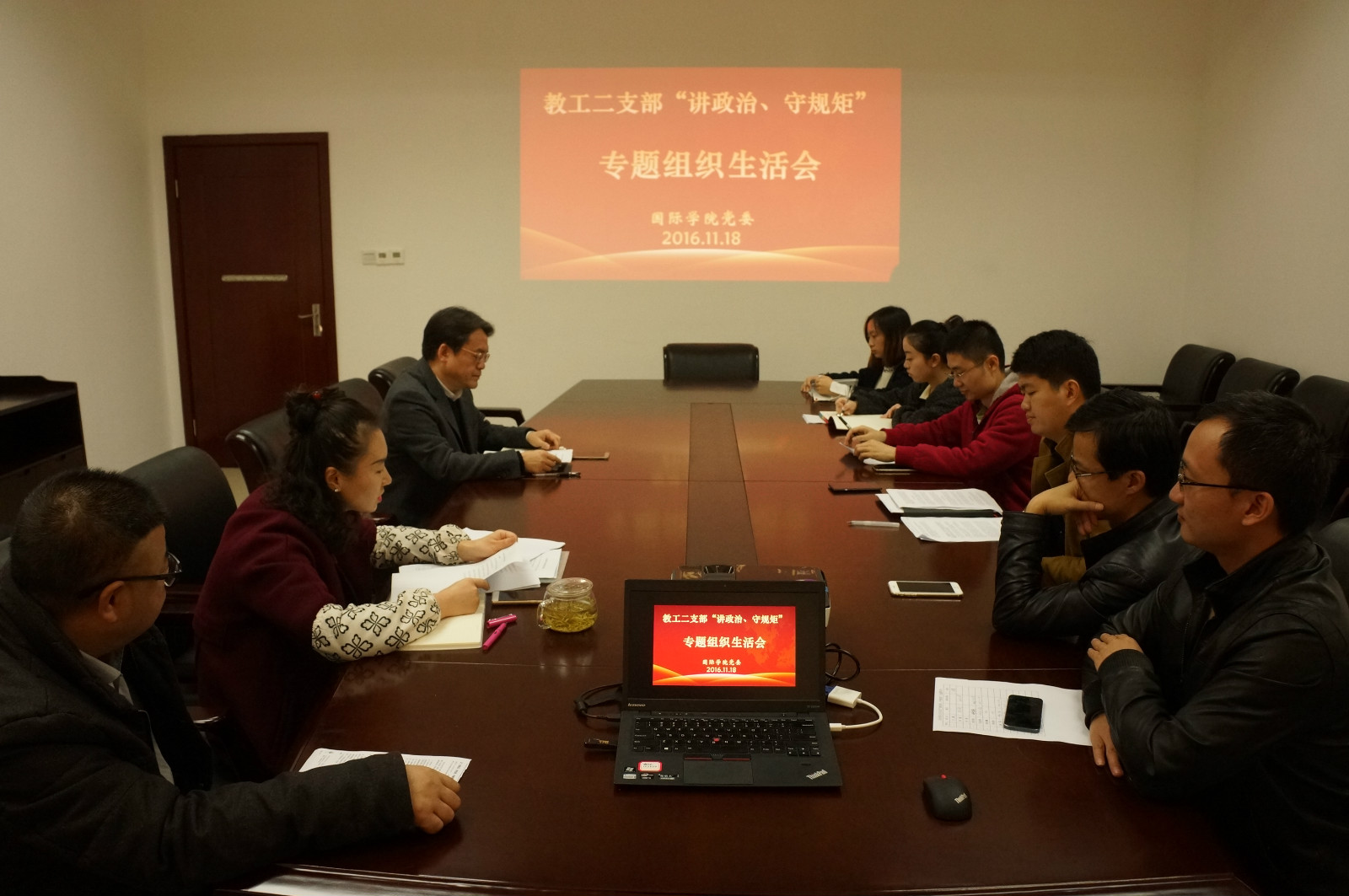 11月18日上午十点半,国际公司党委教工二支部在永利3044noc304会议室开展“讲政治、守规矩”专题组织生活会,支部10名正式党员及2名预备党员参加了学习研讨。