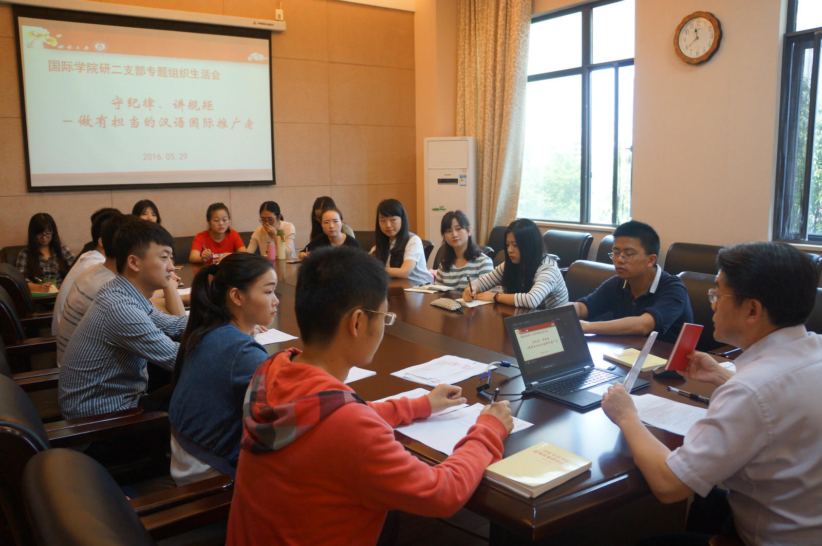 5月29日上午,公司研究生二支部在紫云楼310会议室召开专题组织生活会,刘猛书记讲授党课,主题是“守纪律、讲规矩——做有担当的汉语国际推广者”。