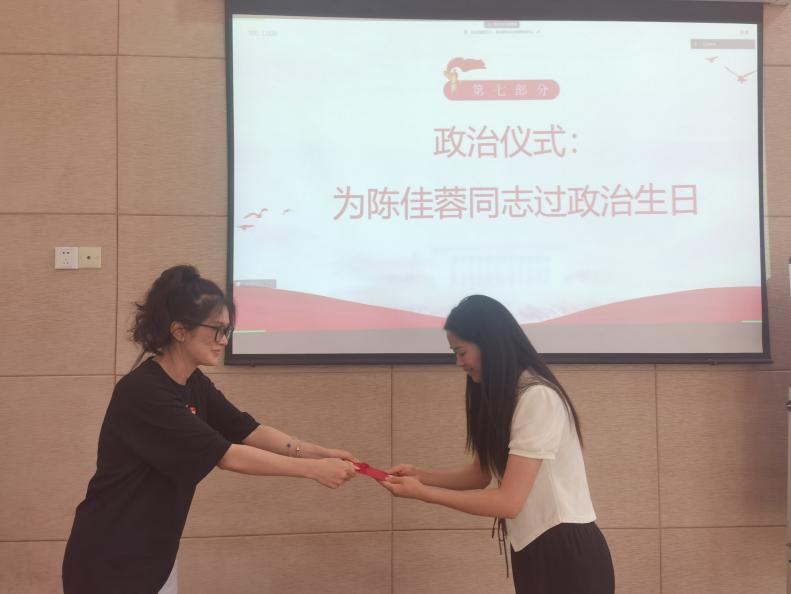 政治生日是引导支部党员强化身份意识的重要仪式,党支部为陈佳蓉同志举行政治生日仪式,曾仪君同志为陈佳蓉同志赠送印着入党誓词和寄语的政治生日贺卡,全体同志进一步感受到了党组织的关怀和温暖,切实增强了党员的荣誉感、责任感和使命感。
