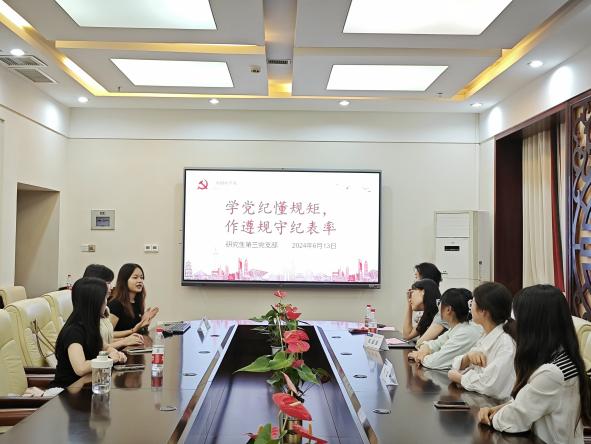 2024年6月14日下午15:00,研究生第三党支部在紫云楼会议室召开“学党纪懂规矩,作遵规守纪表率”主题党日活动。