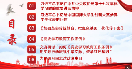 陈苗苗同志领学《党史学习教育工作条例》的总体架构和具体内容。她表示,《党史学习教育工作条例》共六章、三十四条,总结了党史学习教育的宝贵经验,明确了四个方面的主要任务。我们应坚持学党史和悟思想相统一,把学习党的创新理论摆在党史学习教育的首要位置。