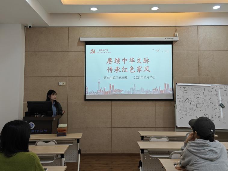 2024年11月15日下午14:30,研究生第三党支部在紫云楼310室开展了以“赓续中华文脉,传承红色家风”为主题的党日活动。